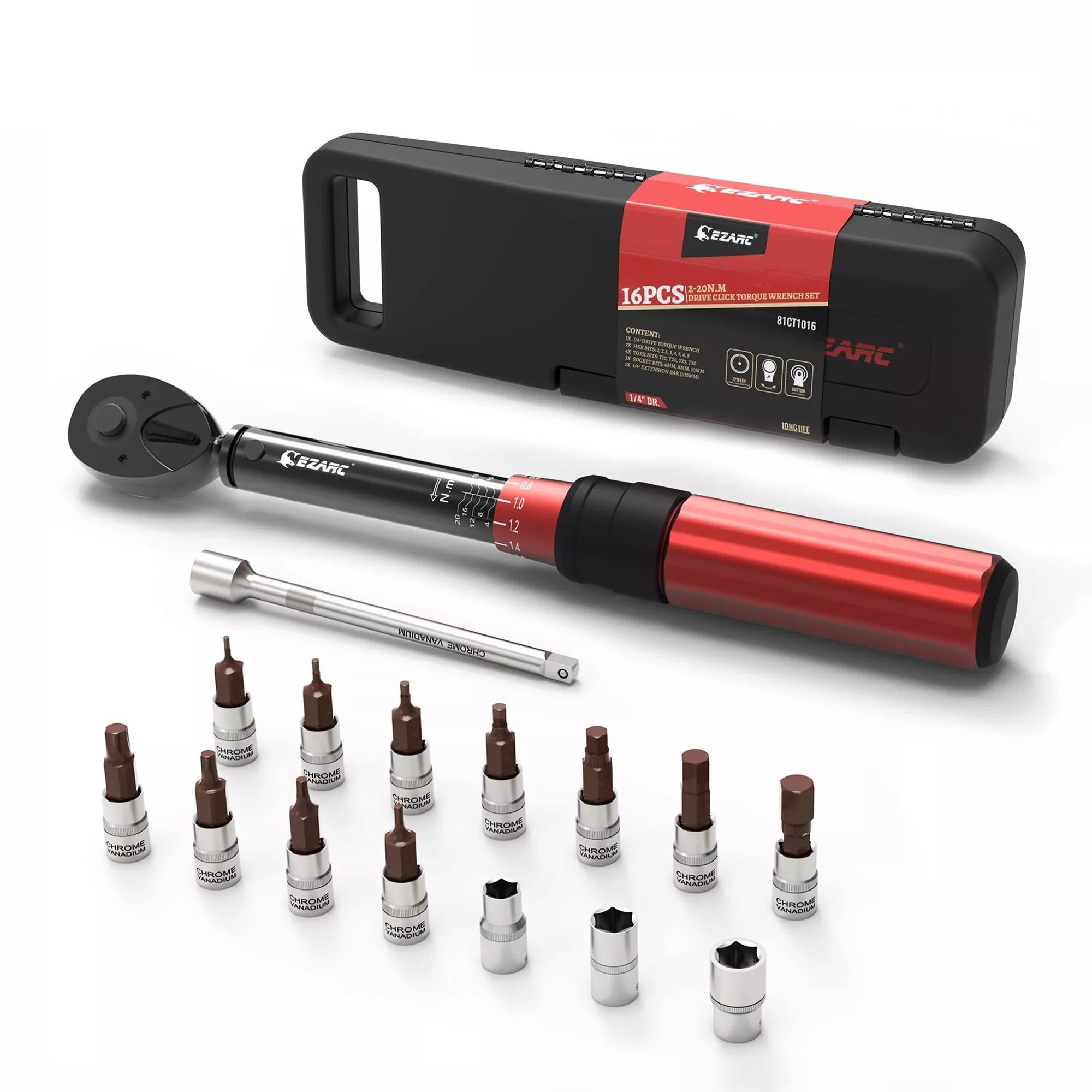 Take the guesswork out of bike and equipment maintenance with this professional 16-piece torque wrench set. Designed with a 1/4-inch drive and a precise 2–20 Nm torque range, this tool ensures that every bolt is tightened with absolute accuracy. Whether you’re adjusting a seat clamp, chain set, or delicate headset, you can trust this torque wrench to deliver the right force every time, protecting your components and extending their lifespan.