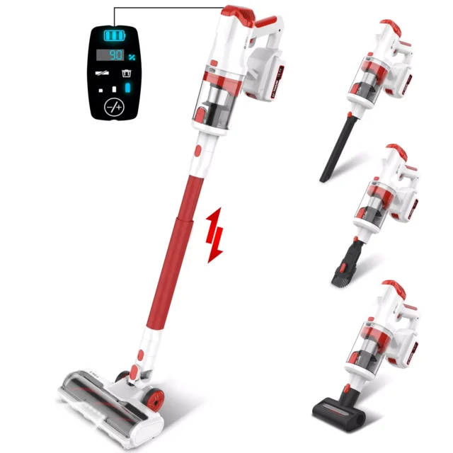 This stick vacuum is more than just powerful — it’s smart and convenient. The built-in LED display gives you real-time updates on battery life and suction modes, so you’re always in control. With up to 60 minutes of runtime and 3–4 operating modes, you can clean your entire home on a single charge without interruptions. Its lightweight build (weighing between 6.6–13.2 lbs) and cordless design allow for easy maneuvering, while the handheld option lets you clean furniture, car interiors, and stairs effortlessly.