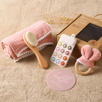 Newborn Gift Set – Wooden Brush, Milestone Cards, Rattle, Blanket & Bath Toys