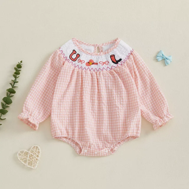 Baby Girl Western Embroidered Plaid Romper – Long Sleeve Cotton Jumpsuit