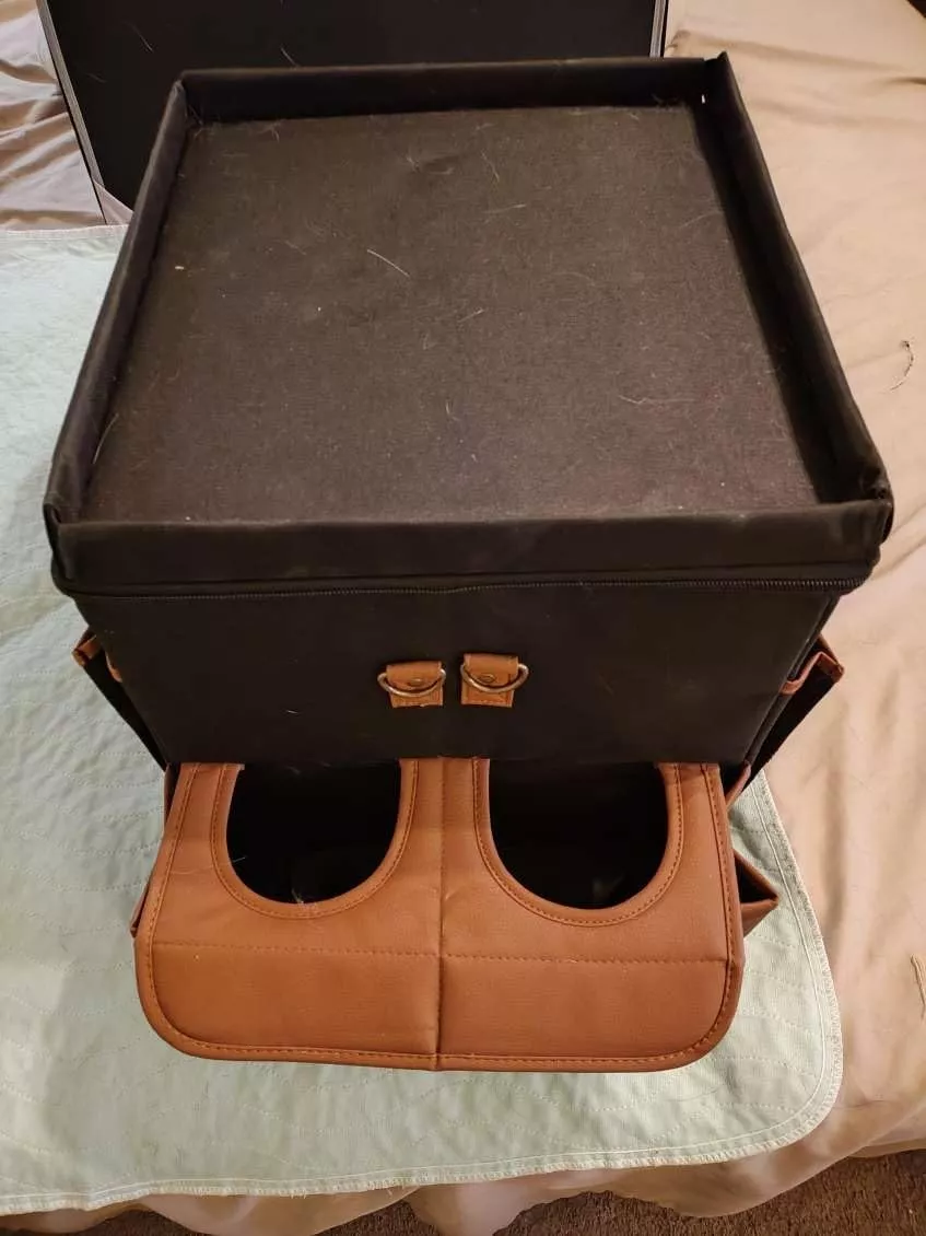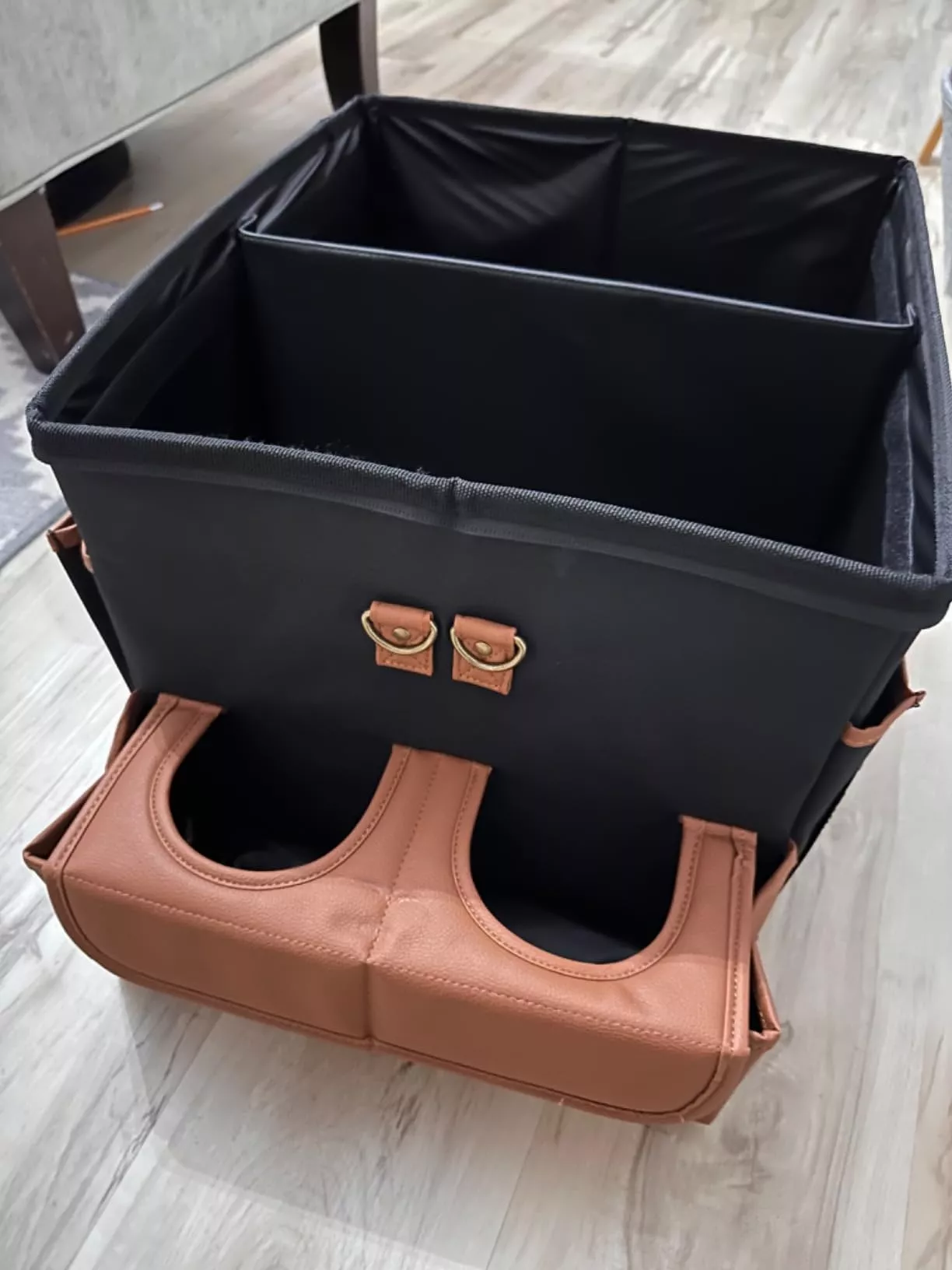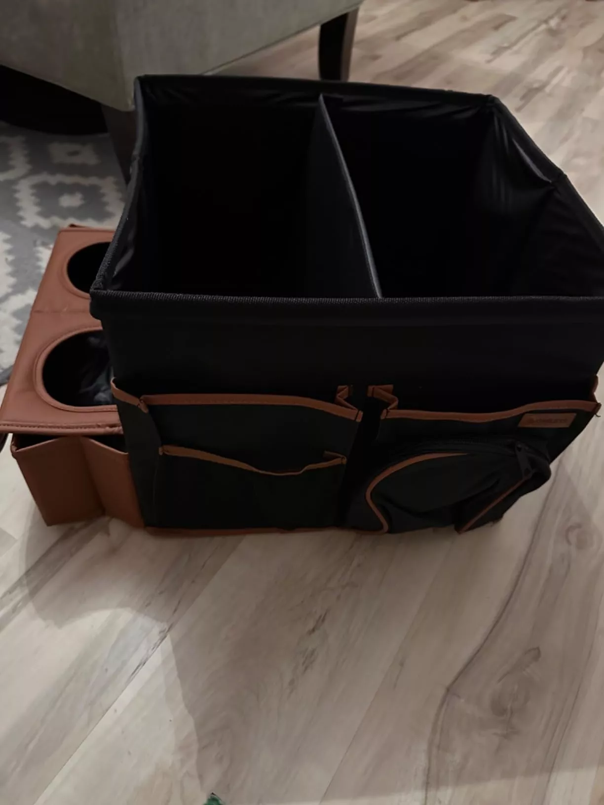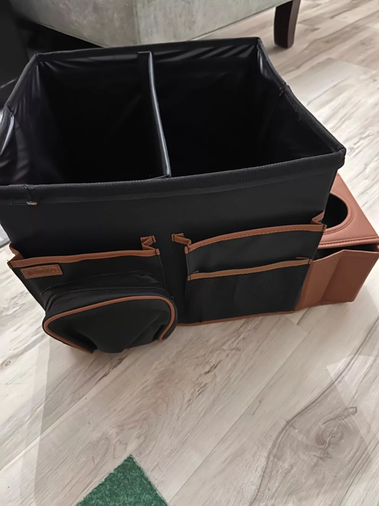 I bought two of these, and I'm planning to give one to my daughter. It feels strong and durable, and for now, I have my wipes, sunglasses, and tissues in it. It can also hold drinks easily and sits nicely on the seat. I like that I can rearrange the compartments to fit whatever I need to put in it.