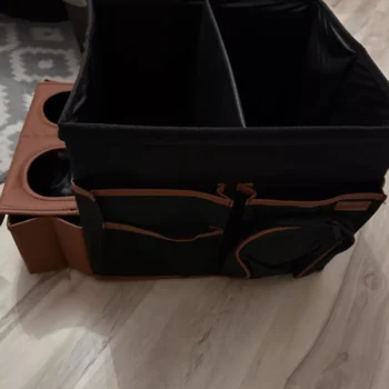 I bought this thing to keep all my car cleaning stuff organized in my trunk. And it really does the job! I was worried that I got one that was too big, but it turns out, I'm glad I got the larger size! All my car cleaning supplies fit nicely in the different compartments. So far, this product is really great! It helps me keep everything organized and tidy.