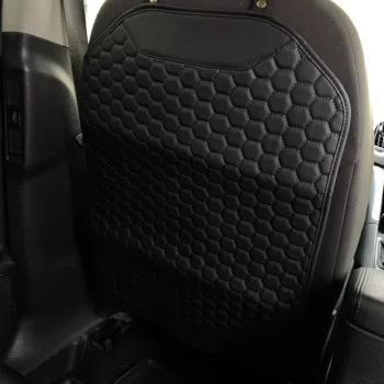 Our seat back protector features a five-layer construction with upgraded premium eco-leather on top, two layers of high-density foam, 600D Oxford, and an anti-slip rubber backing.
