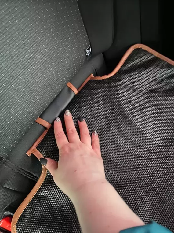 This seat protector attaches securely to the seat with durable metal hooks and installs easily in less than a minute.