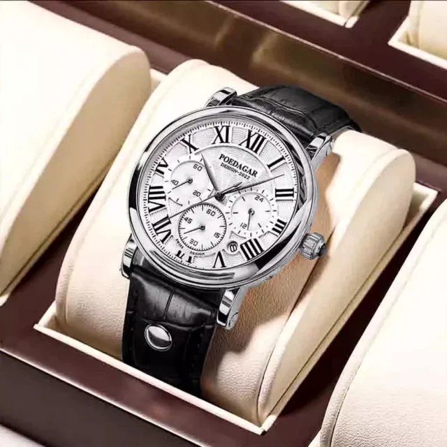 Unlike ordinary watches, this piece is designed for the modern business man who values sophistication without sacrificing function. Its luminous dial ensures clarity even in low light, while the chronograph and calendar features make it highly practical. The elegant leather band and Roman numeral display bring a refined, classic look that suits formal business attire as well as smart-casual outfits. Whether you’re at a board meeting, attending an evening event, or traveling, this watch delivers both style and reliability.