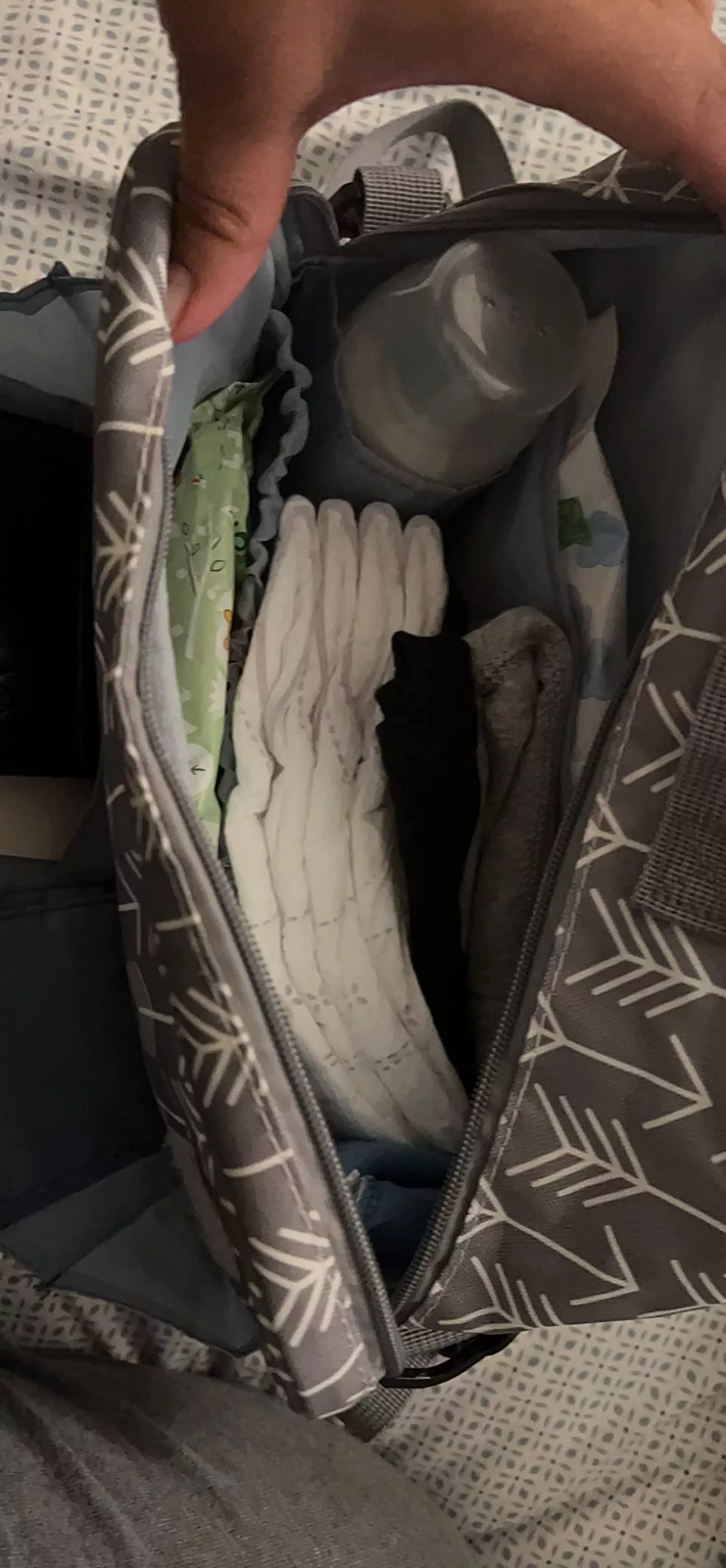 I LOVE this bag!!! Fits 10 diapers, a small pack of wipes, diaper cream, an extra outfit, some toys, and snacks. After moving past the newborn stage, I wanted something smaller than a giant bag. This is perfect!