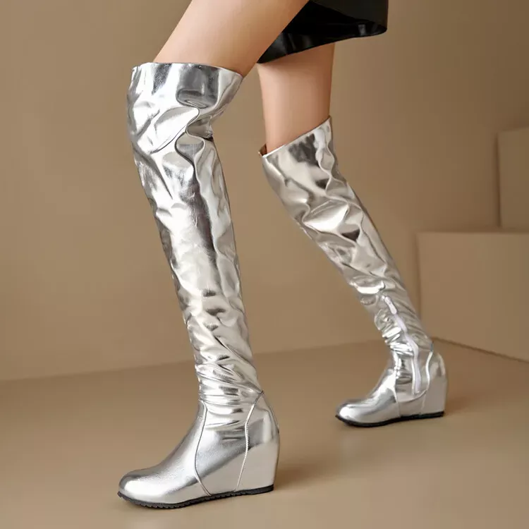 Unlike ordinary boots, these over-the-knee wedge styles combine bold glamour with true comfort. The shiny PU finish, oversized fit options, and handmade craftsmanship make them stand out in the crowd. They’re not just boots—they’re a statement piece that commands attention and celebrates fearless fashion.