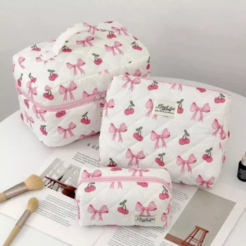 Cherry Bow Quilted Makeup & Toiletry Bag