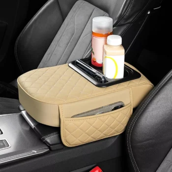 Car Armrest Cushion with Dual Cup Holders and Storage Pocket