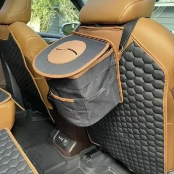 I received my order in 3 days, in a cute box and packaging. This trash can looks very stylish. I think it’s the perfect design for black, beige, or brown car interiors. Has double bottom, carrying strap, additional side pockets for wet wipes or other things. Tried to pour water inside, nothing leaks. Vey satisfied with my purchase and recommend ordering this!