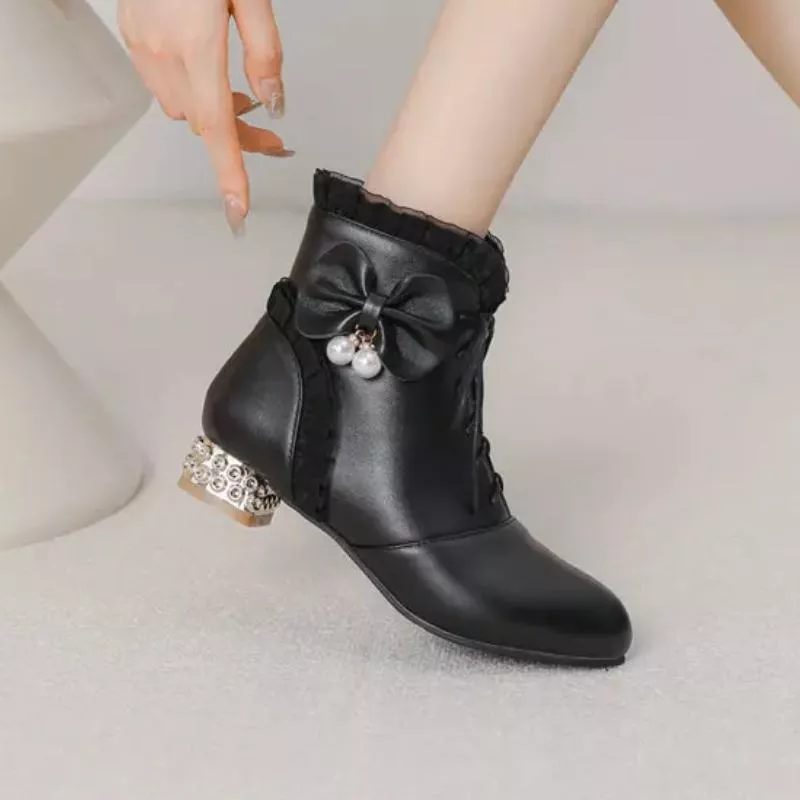 The charming butterfly knot detail adds a feminine flair, while the classic lace-up design ensures a secure fit. The 1.2-inch (3 cm) square block heel gives you just the right amount of lift without sacrificing comfort, making them perfect for walking, shopping, or social gatherings. The rubber outsole provides reliable grip, so you can step with confidence on different surfaces. With a shaft height just above the ankle, these boots flatter your legs and pair beautifully with dresses, skirts, or jeans.