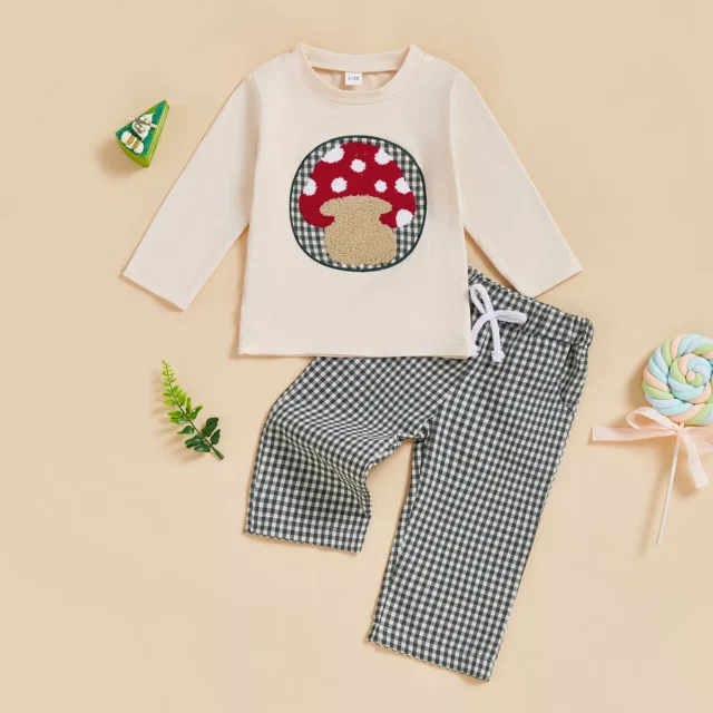 This outfit is made for those crisp fall days filled with leaf piles, apple picking, and cozy cuddles. Whether you’re dressing your little one for a casual outing, daycare, or a family gathering, this set strikes the perfect balance between comfort and seasonal style. The sweet mushroom embroidery on the shirt brings a touch of whimsy, while the timeless plaid pants add a classic autumn feel.