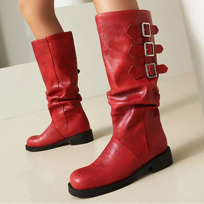 Vintage Knee-High Western Boots for Women – Buckle Detail, Low Heel