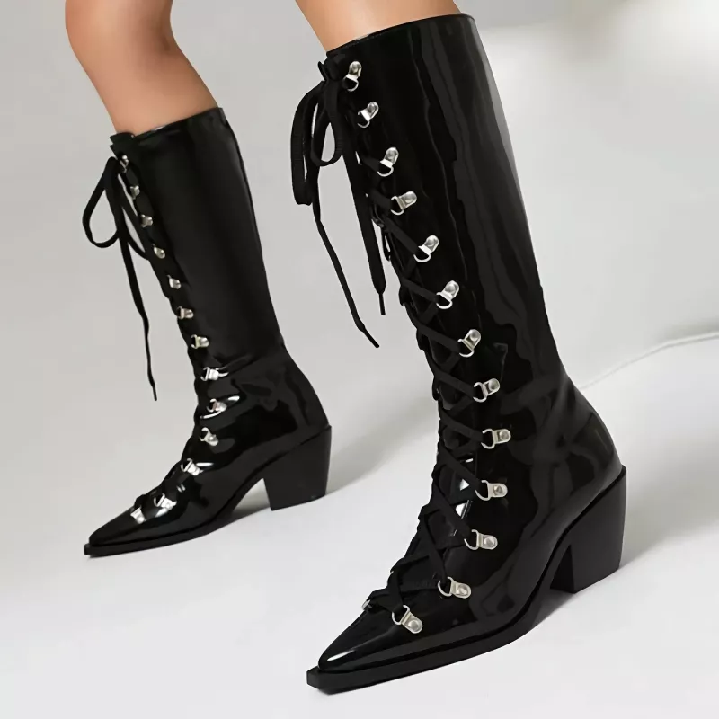 Turn every entrance into a statement with these elegant women’s knee-high boots. Designed in sleek patent leather, these boots combine modern sophistication with everyday comfort. The glossy finish and lace-up detail add a fashionable edge, making them perfect for both casual outings and special occasions. Whether you’re heading to a party, a night out, or simply want to elevate your everyday look, these boots are the ultimate wardrobe essential.