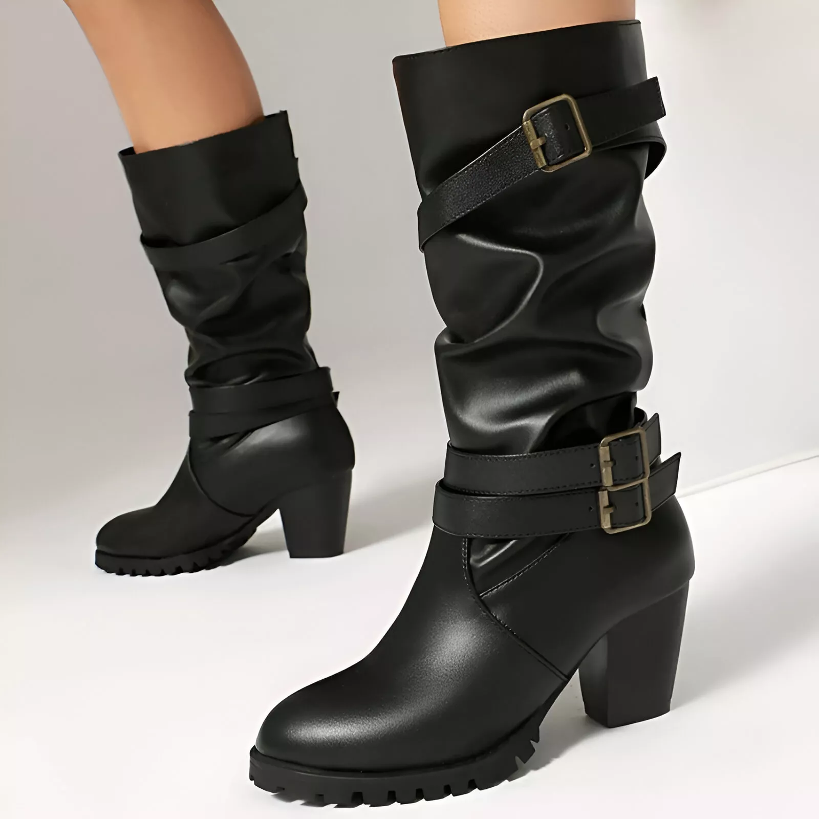 Make a bold fashion statement this winter with these chic and cozy Pleated Mid-Calf Western Boots. Designed for women who love effortless style and everyday comfort, these boots blend modern trends with classic western flair. With a pleated finish, buckle detail, and a low square heel, they’re your new go-to pair for chilly days, stylish outings, and casual rides alike.