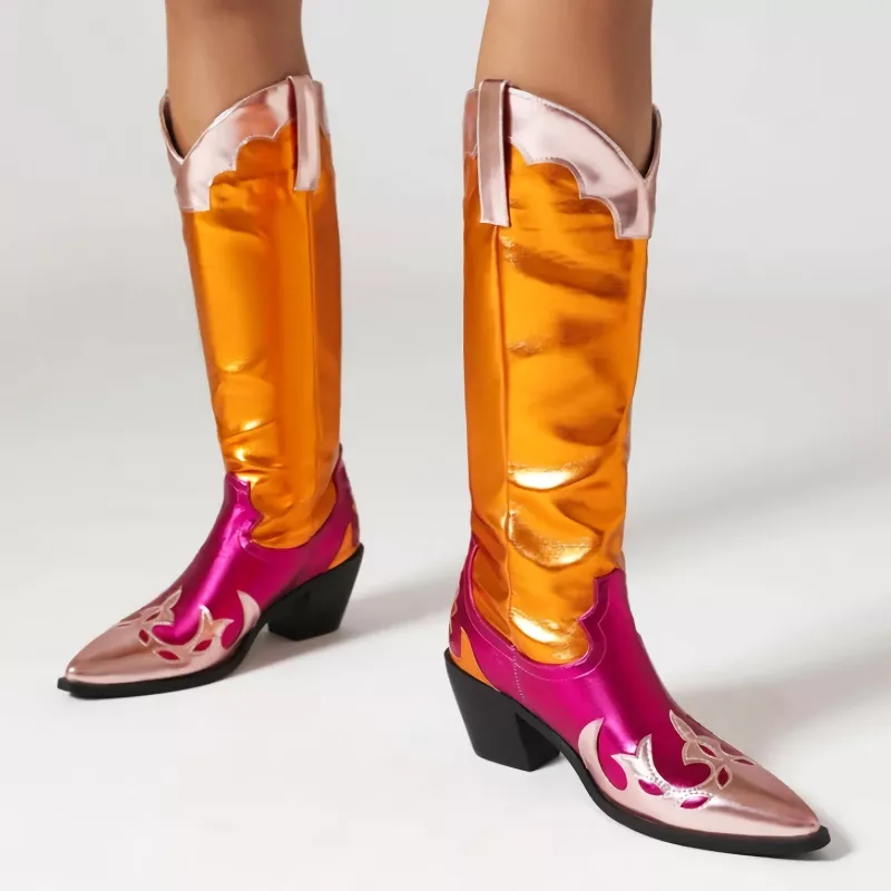 Turn heads this season with these stunning women’s western cowboy knee-high boots, designed to combine elegance, comfort, and a touch of daring style. Featuring a gorgeous patchwork of gold and pink tones, these boots are the perfect blend of classic western flair and modern chic. Whether you’re stepping out for a night on the town, dressing up your casual outfits, or adding edge to your winter wardrobe, these boots will instantly elevate your look.